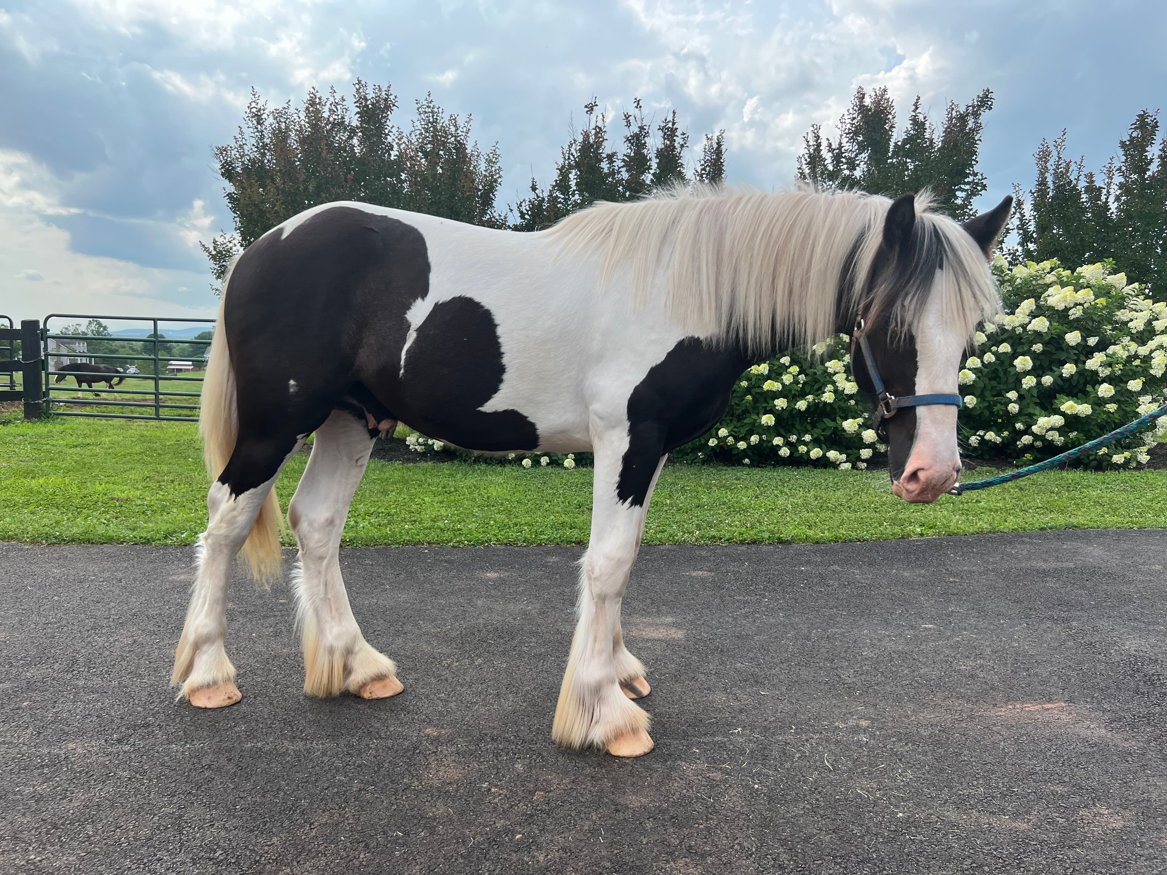 Jupiter is a yearling Gypsy Vanner gelding standing a little under 14.2H currently. Dam is a 15.3H Drum and sire “Chasing a Dream” is a registered Gypsy standing at 15.2H, so he should mature to a comparable height. He is a total gentleman with a wonderful temperament! He is super calm and loves attention, being brushed, bathed and worked with. He ties, picks up his feet, stands for the farrier, leads nicely and already loads. Jupiter has the temperament to do anything in the future. He’s used to chickens, dogs, equipment, kids- nothing much phases him! He is also very attractive!